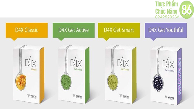 Các sản phẩm D4X -Get Active, Get Young, Get Smart, và Get Detox rất thiết yếu cho sinh hoạt lành mạnh và hình thành chế độ dinh dưỡng cân bằng.
