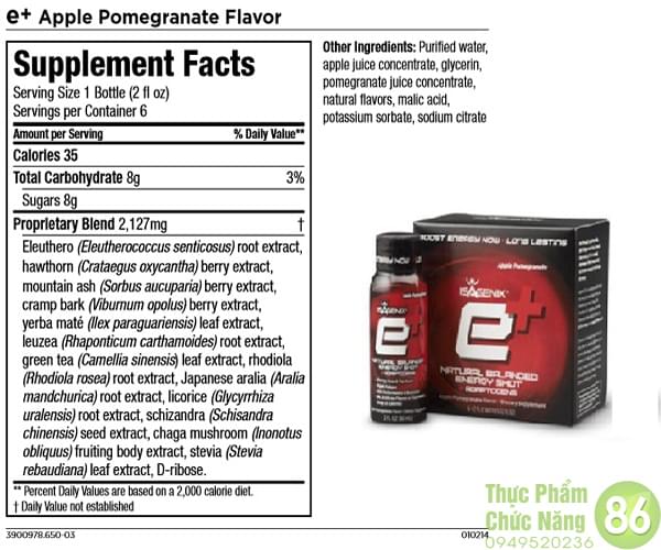 Chức năng: e+ tăng sinh lực nhanh chóng và duy trì sinh lực trong hàng giờ mà không gây bồn chồn hoặc tác dụng phụ như các loại đồ uống tăng lực truyền thống. Đồ uống được đóng gói tiện lợi, giúp duy trì sự minh mẫn và dẻo dai đồng...