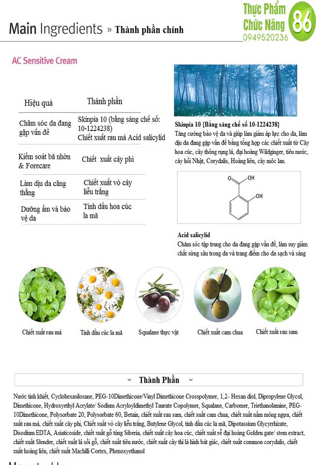 Kem dưỡng da AC Sensitive Cream là một dòng sản phẩm có thành phần tự nhiên, không chứa hóa chất độc hại giúp bảo vệ làn da, cân bằng độ ẩm, cung cấp một lượng ẩm cần thiết để làn da luôn khỏe mạnh. Chiết xuất rau má và cây phỉ giúp làn da được bảo vệ tối đa.