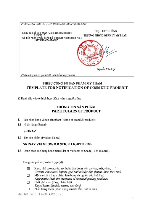 GIẤY CÔNG BỐ CỦA BỘ Y TẾ VỀ SẢN PHẨM KEM NỀN BBSTICK SKINAZ