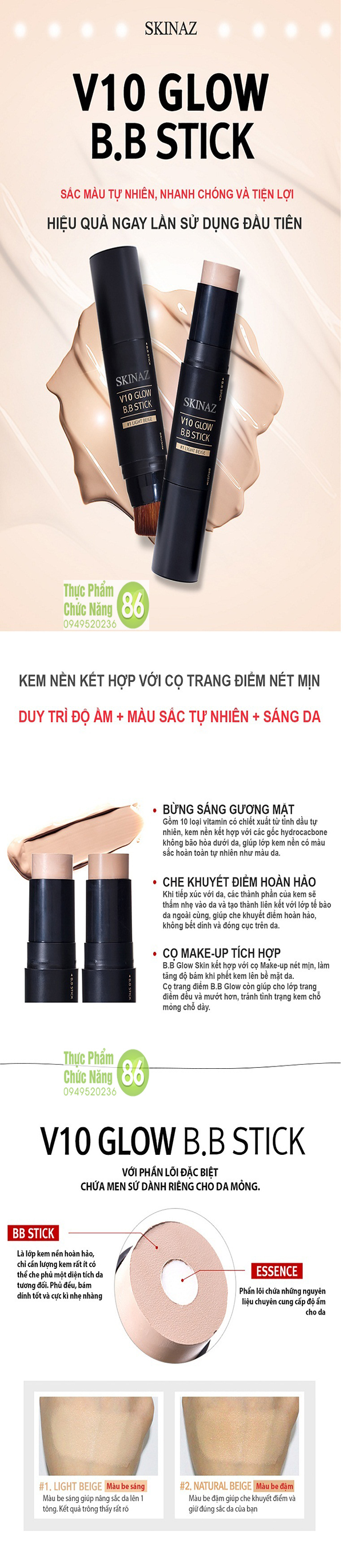 Kem nền V10 Glow B.B Stick Skinaz kết hợp cọ trang điểm nét mịn dạng thỏi 2 in 1 cao cấp Hàn Quốc chính hãng GIẤY CÔNG BỐ CỦA BỘ Y TẾ VỀ SẢN PHẨM KEM NỀN BBSTICK SKINAZ Cam kết đảm bảo: Sản phẩm nhập trực tiếp từ Hàn Quốc – chính...