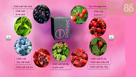 Pink là hỗn hợp của trên 40 thành phần, loại thảo mộc, được chứng minh là có nhiều tác dụng đối với sức khỏe và thẩm mĩ của con người, đặc biệt là đối với phái nữ như: Axit Citric, Amino axit, Chiết xuất lá trà xanh, Cây Ashwagandha, Chiết xuất cây Việt Quất, Quả lựu, Quả Sơ ri, Chiết xuất hạt đậu cà phê xanh, Bioflavonoids, Rhodiola Rosea, COQ10, Rễ cây nhân sâm châu Mỹ, Dâu Acai, Chiết xuất dâu Goji, Superoxide Dismutase, Shilajit, Chiết xuất hạt nho, Axit Alpha Lipoic (ALA), Nhân sâm Siberi, Rễ gừng (Củ gừng)…