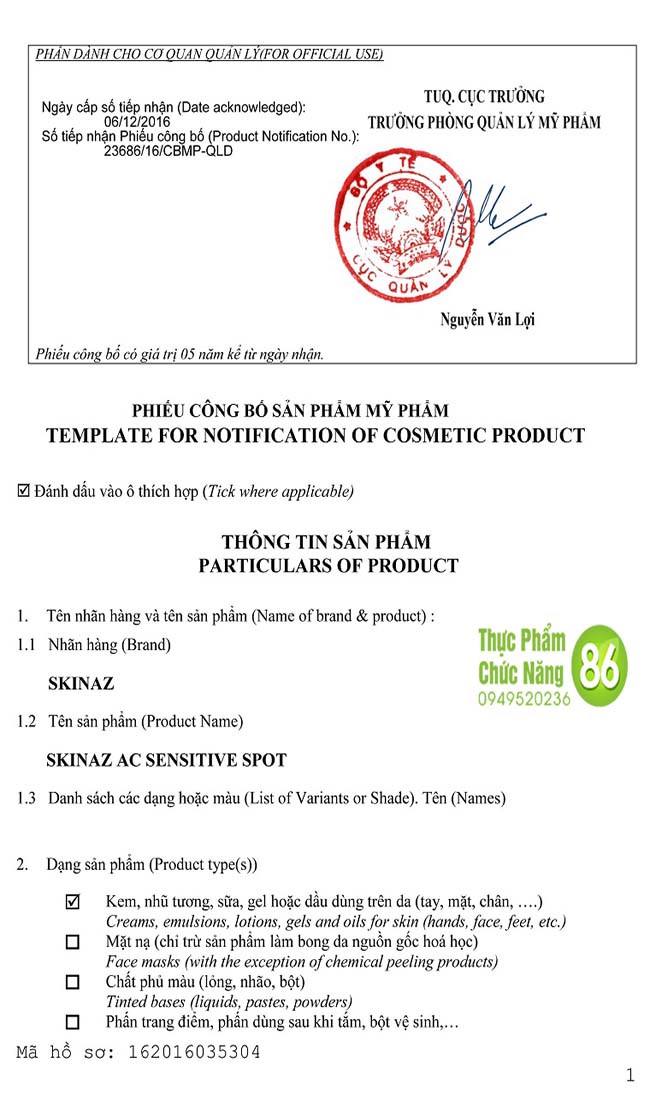 Giấy công bố của bộ y tế về sản phẩm Serum AC Sensitive Spot:
