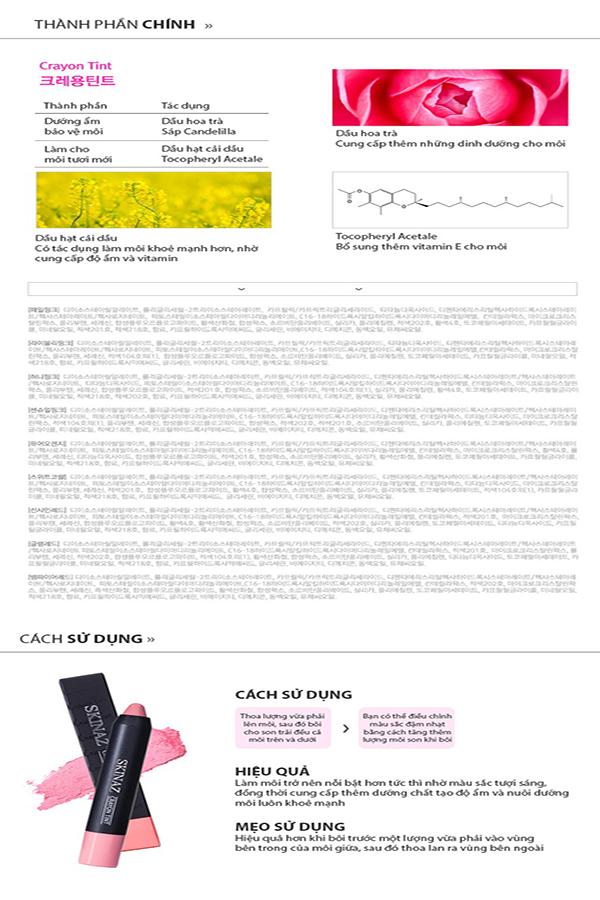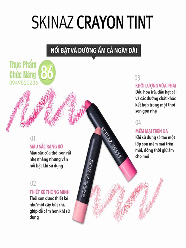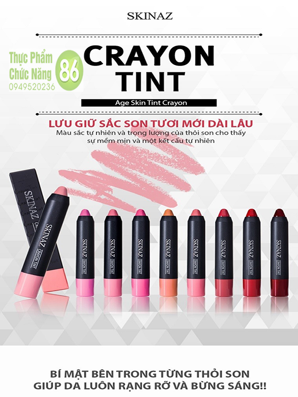 Son Crayon Skinaz cao cấp Hàn Quốc sẽ chính là lựa chọn số 1 cho các chị em. Son môi Crayon tint Skinaz hiện nay đang làm mưa làm gió tại xứ sở sắc đẹp Hàn Quốc và đã lan tỏa đến hơn 15 quốc gia trên toàn thế giới, nay đã đến Việt Nam.