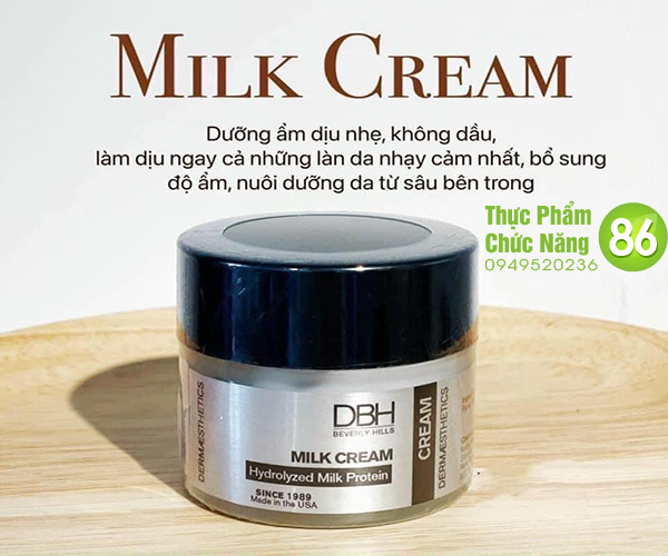 DBH Milk Cream được sản xuất với công thức độc quyền PowerBlend với Milk Protein (đạm sữa cô đặc) và Lô Hội. Thành phần còn chứa Vitamin E giúp nuôi dưỡng, cân bằng da và cấp ẩm từ sâu bên trong. Bên cạnh đó, các thành phần thiên nhiên có trong sản phẩm giúp làm dịu mát làn da và tăng cường giữ ẩm, tinh dầu oải hương giúp làm dịu, kháng khuẩn cho da.