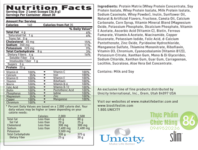 Đạm Matrix (Đạm Whey, đạm đậu nành cô đặc, đạm Whey cô đặc, đạm sữa cô đặc, natri caseinat, bột Whey), Inulin, dầu hướng dương, hương tự nhiên & nhân tạo, đường Fructose, dầu Canola, Calcium Carbonate, sirô bắp, hỗn hợp Vitamin và khoáng chất (Magie, Kali, Canxi, Vitamin E, Vitamin C, Biotin, sắt, Vitamin A, Niacin, đồng, I ốt, axit Folic, d-canxi pantothenate, Zinc oxide, Pyridoxine hydrochloride, Mangan Sulfate, Thiamine mononitrate, Riboflavin, Vitamin D3, Chromium, Cyanocobalamin (Vitamin B12)), potassium Citrate, Xanthan Gum, Mono & Di glycerides, Sodium Chloride, Xanthan Gum, Guar Gum, Carrageenan, Lecithin, Sucralose, Aloe Vera Gel Tập trung.