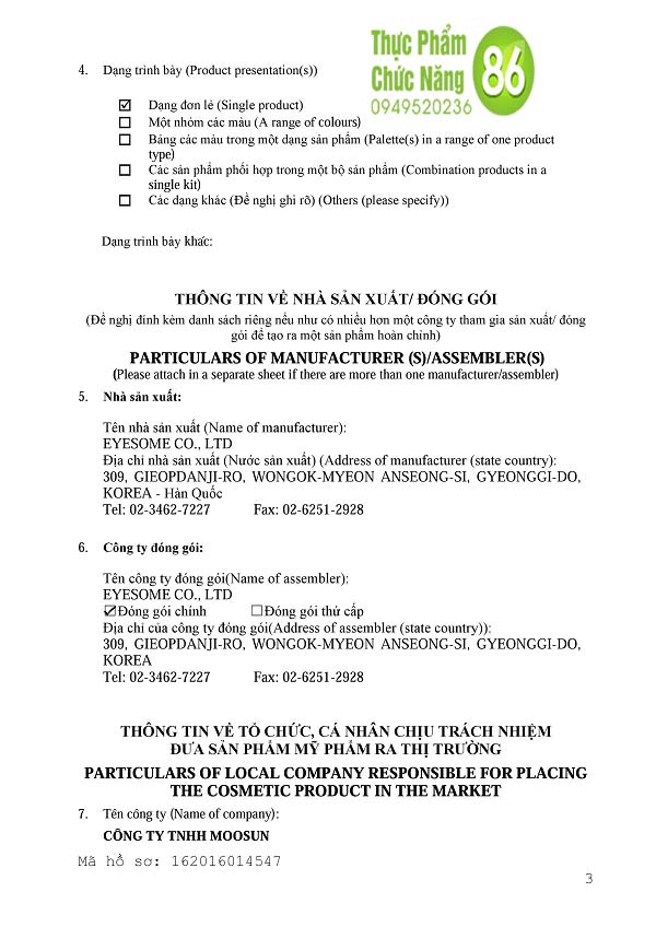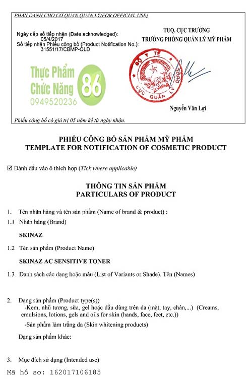 GIẤY CÔNG BỐ CỦA BỘ Y TẾ VỀ SẢN PHẨM TONER AC SKINAZ:
