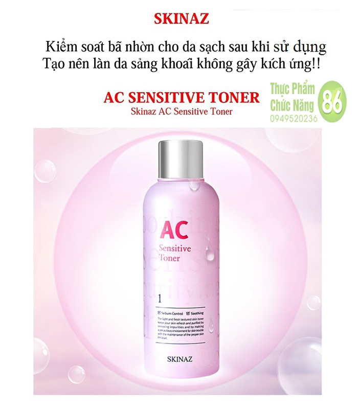 Nước cân bằng da cao cấp 6 in 1 làm sạch sâu trong da, kiềm dầu, se khít lỗ chân lông, ngăn mụn, trắng mịn da, mờ nám tàng nhang AC Sensitive Toner Skinaz Hàn Quốc chính hãng - 180ml