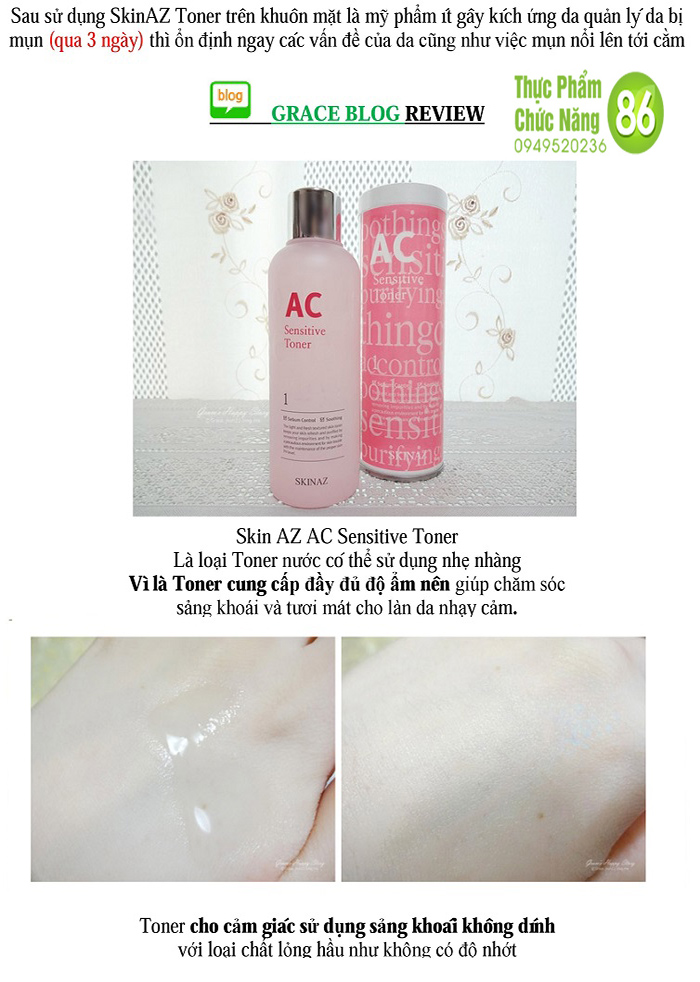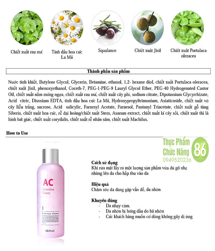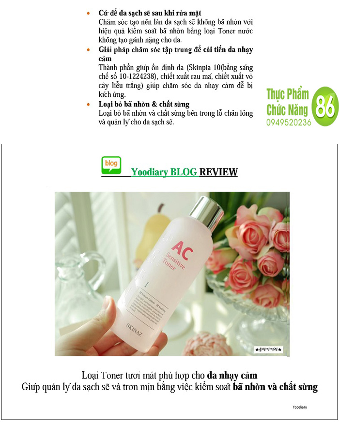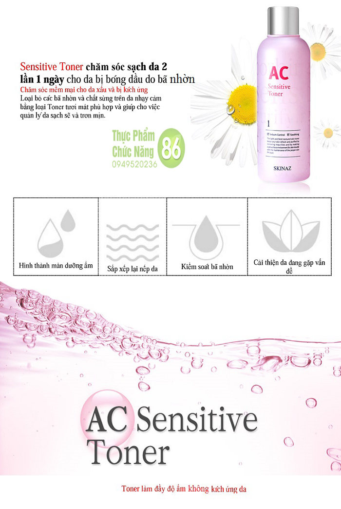Nước cân bằng da cao cấp 6 in 1 làm sạch sâu trong da, kiềm dầu, se khít lỗ chân lông, ngăn mụn, trắng mịn da, mờ nám tàng nhang AC Sensitive Toner Skinaz Hàn Quốc chính hãng - 180ml Nước hoa hồng AC Sensitive Toner cao cấp 6 in 1...