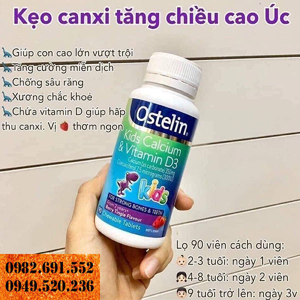 - Khi bé từ 2 tuổi trở lên, các mẹ bổ sung thêm Canxi cho con có thể đổi từ canxi milk sang Canxi dạng Viên của Ostelin (Úc), dễ uống hơn Canxi milk (bé có thể uống, nhai rất thơm ngon), ngoài ra HÀM LƯỢNG CAO HƠN nên phù hợp với trẻ từ 2 tuổi trở lên