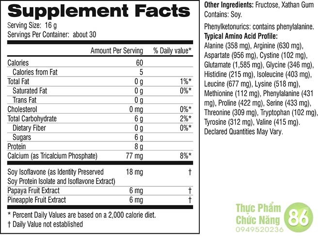 Soy isoflavone ( protein đậu nành cô đặc và chiết xuất isoflavone ) , Fructose, canxi (như như Tricalcium, phosphate), Xanthan Gum, chiết xuất từ đu đủ và chiết xuất từ dứa.