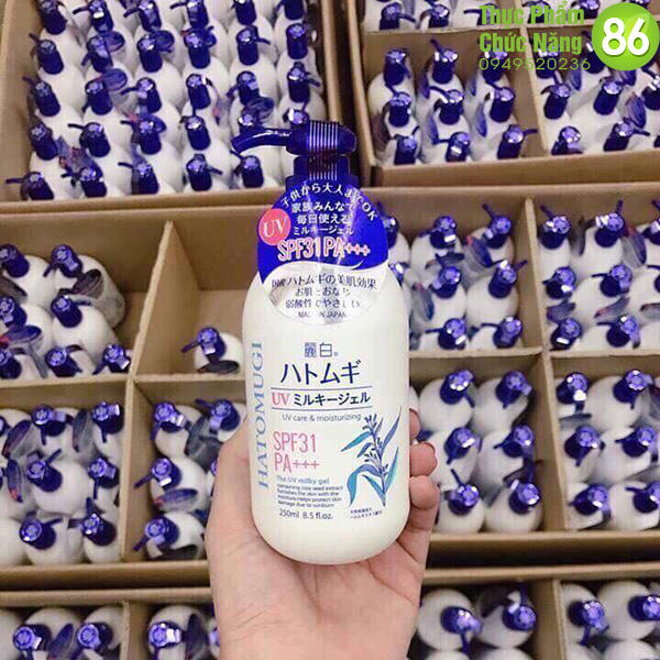 - Kem dưỡng thể chống nắng Hatomugi UV Milky Gel 250ml là sự kết hợp hoàn hảo của 3 công dụng trong 1 sản phẩm ( dùng được cho cả mặt và body ) , sản phẩm được tung ra thị trường bởi hãng Hatomugi đã nhận được sự phản hồi tích cực cũng như ưa chuộng của chị em phụ nữ trong thị trường nội địa Nhật Bản.
