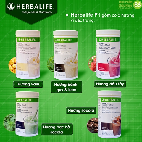 Sữa Herbalife F1 có 5 hương vị thơm ngon bổ dưỡng đáp ứng nhu cầu thị hiếu của người dùng: Sữa Herbalife hương vani, hương socola, hương dâu, hương bạc hà, hương quy kem.