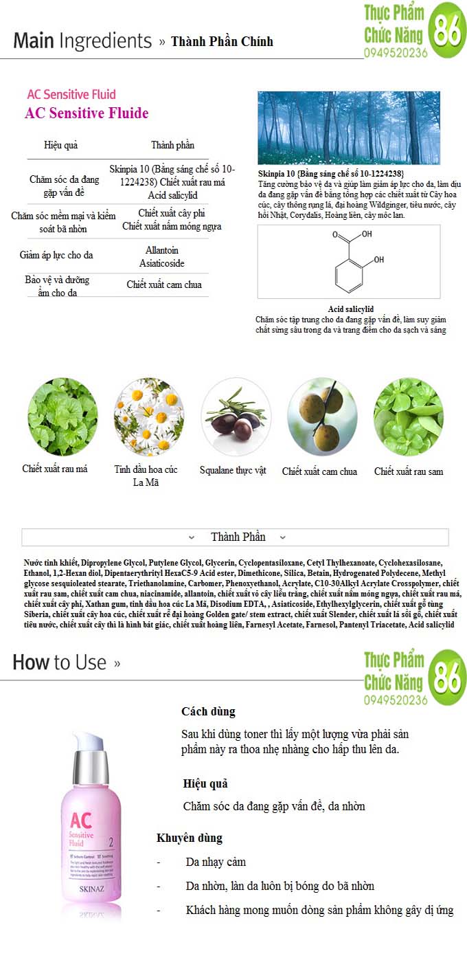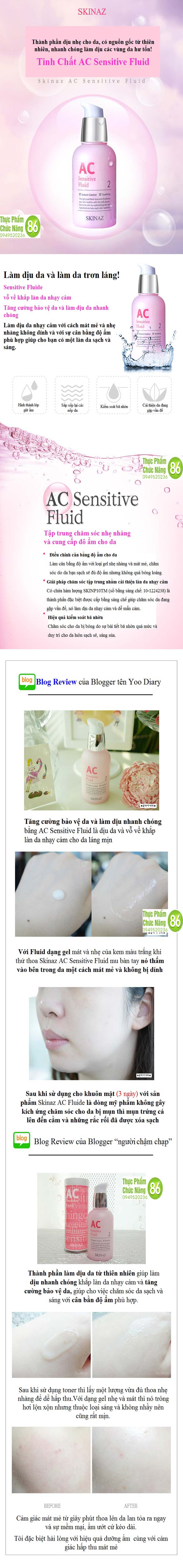 Mọi vấn đề này đều đã được giải quyết với sản phẩm Tinh chất AC Sensitive Fluid cao cấp từ thương hiệu Skinaz. Sản phẩm đã được rất nhiều phụ nữ nổi tiếng tại Hàn Quốc tin tưởng sử dụng.