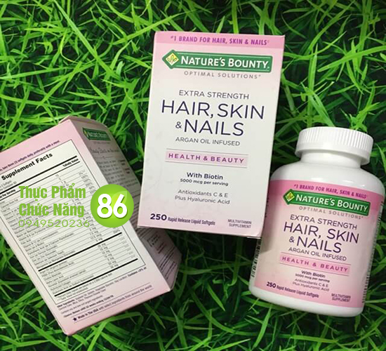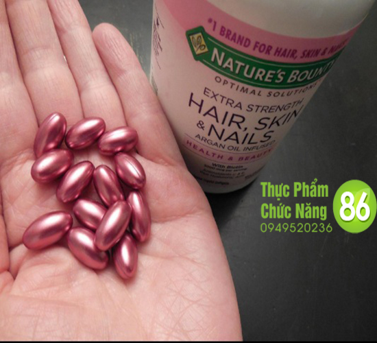 Viên uống đẹp da tóc và móng Nature’s Bounty Hair Skin & Nails với công thức chứa toàn bộ các vitamin và khoáng chất cần thiết mỗi ngày – cung cấp cho cơ thể của bạn tất cả các chất dinh dưỡng cần thiết để hỗ trợ cho sức khỏe tốt và một lối sống năng động. Là Vitamin tổng hợp cho sắc đẹp của bạn Hair Skin & Nails cung cấp các chất dinh dưỡng mà cơ thể của bạn cần cho mái tóc khỏe mạnh, bóng mượt, cho da sáng hồng và cho móng chắc khỏe.