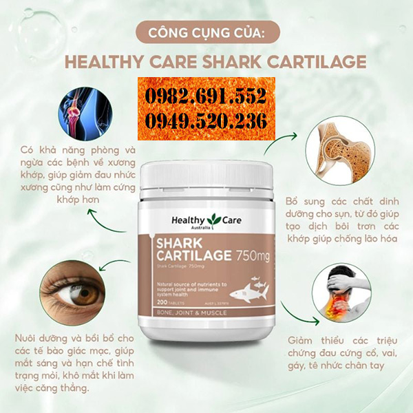 - Viên uống sụn vi cá mập bổ xương khớp Healthy Care 750mg giúp tăng cường sự linh hoạt và đàn hồi của khớp, tăng cường độ dẻo dai của sụn khớp, giúp giảm đau của khớp.
