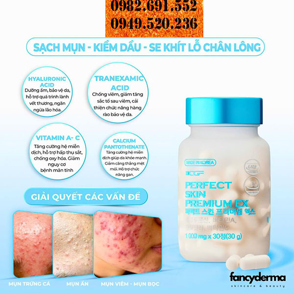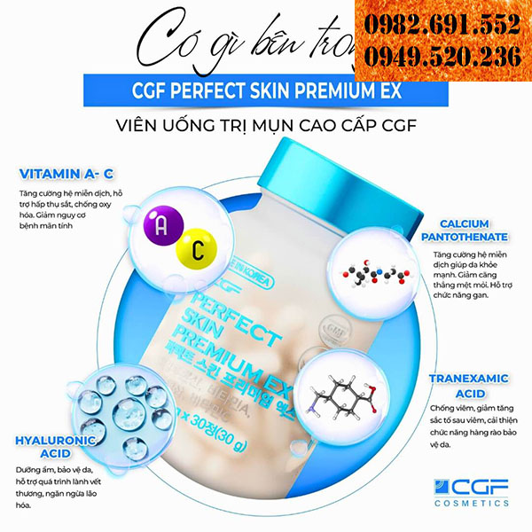 Viên uống CGF Perfect Skin Premium EX Viên uống giảm mụn CGF Perfect Skin Premium EX là sản phẩm chăm sóc da tiên tiến, được nghiên cứu và phát triển với công nghệ Hàn Quốc, chuẩn y khoa. Không giống các sản phẩm bôi ngoài chỉ tác động bề mặt, thuốc uống trị...